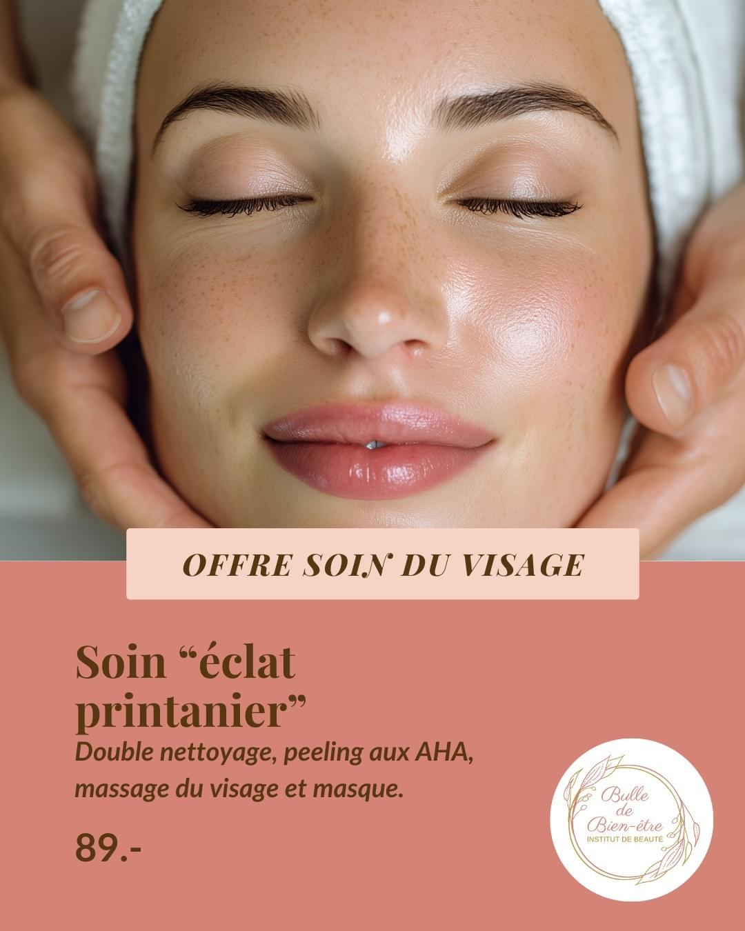 Soin du visage avec double nettoyage, peeling aux AHA. massage du visage et masque hydratant.